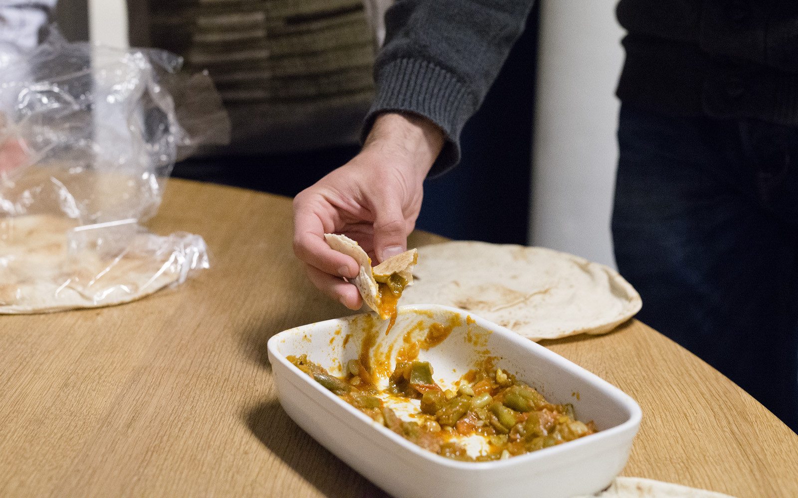Een enkele keer kookt hij voor groepen. Zoals voor de feestavond die de bewoners hadden georganiseerd voor de omwonenden en andere betrokkenen bij de Bredestraat. En na de laatste groepsles Nederlands heeft hij gekookt voor de docenten. Gemiddeld één keer per week eet hij samen met een aantal andere bewoners. Maar meestal eet hij alleen.