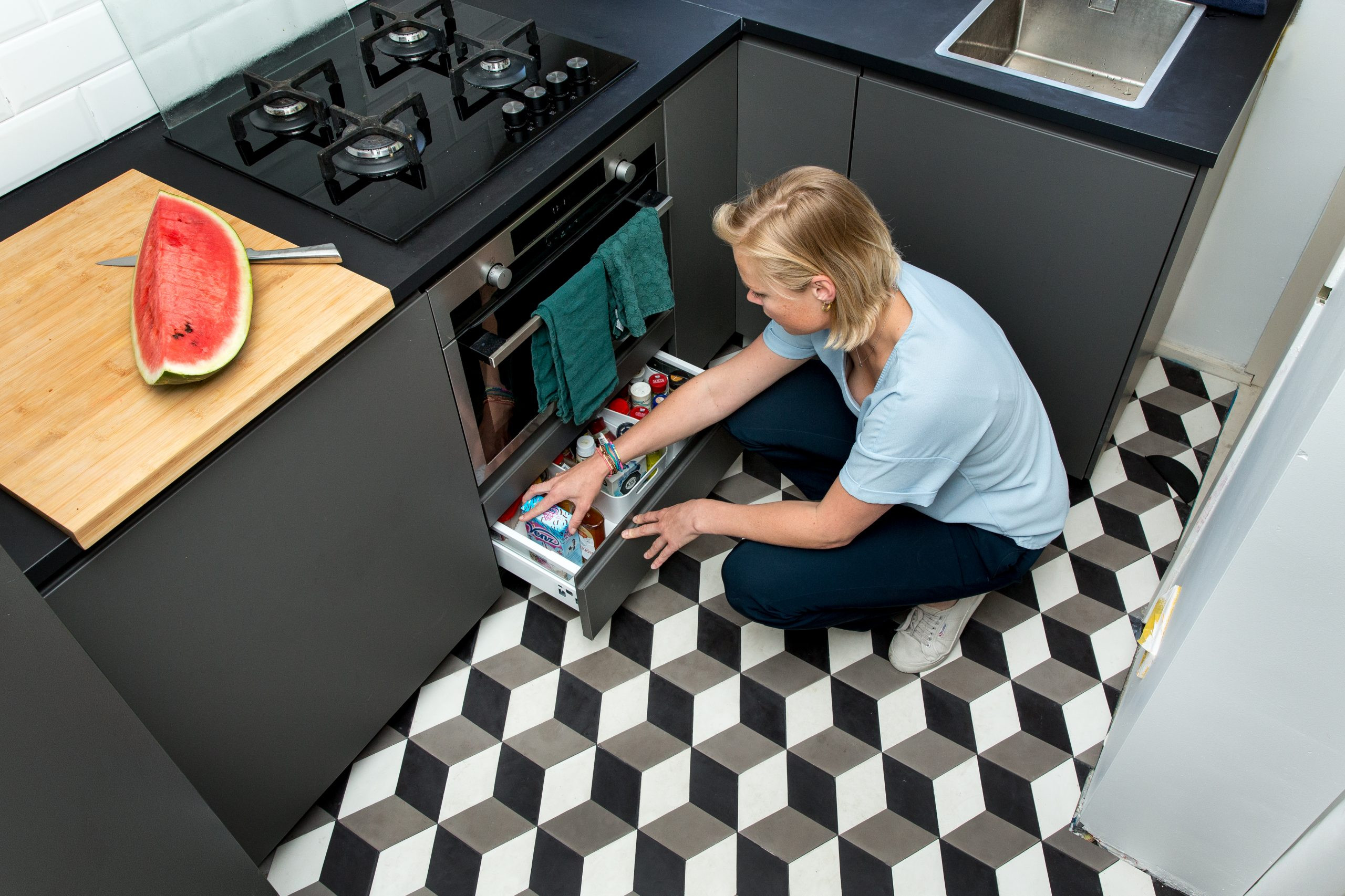 Eveline en Diederik zijn net klaar met het klussen aan hun nieuwe keuken. De muur naar de woonkamer is opengebroken waardoor de twee ruimtes nu één geworden zijn. Eveline: “Ik kook graag terwijl mijn gasten aan tafel zitten. En ik ben heel blij met onze SMEG koelkast en natuurlijk de psychedelische vloer!” Ook Diederik houdt van koken. “Ik ben half Indisch en onze vrienden noemen mijn pittige nasi nu vlam nasi!”, vertelt hij. “Het fijne aan de nieuwe keuken is dat het aanrecht hoog is, hierdoor kan ik lekker rechtop koken.”