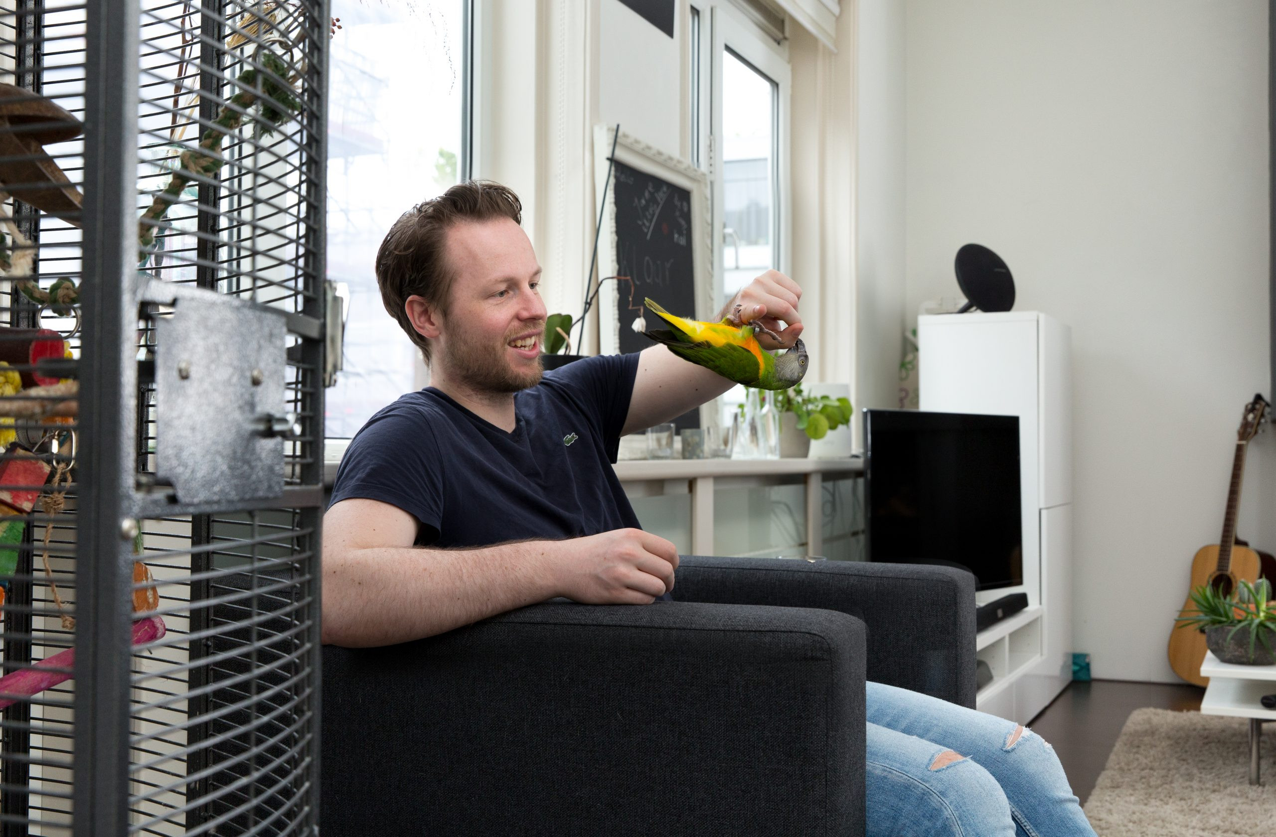 Al is Jane de grote dierenvriend in huis, Yoshi blijkt toch meer naar Jordi toe te trekken. Jordi: “We dachten dat hij met mij zou gaan vechten om het vrouwtje, maar hij is verliefd op mij geworden. En hij is nu dus jaloers op Jane!” Yoshi’s woordenschat breidt dagelijks uit. “Hij oefent ’s ochtends als hij net wakker is en er nog niemand bij is. We zeggen bepaalde woorden heel vaak en dan gaat hij het op een gegeven moment naspreken. Als ik zwaai zegt hij ‘doei Yoshi’. Iedere ochtend als ik naar mijn werk vertrok, zei ik dit tegen hem. En nu hoeven we onze jas maar aan te trekken of sleutels te pakken en hij zegt al gedag!”, vertelt Jordi.