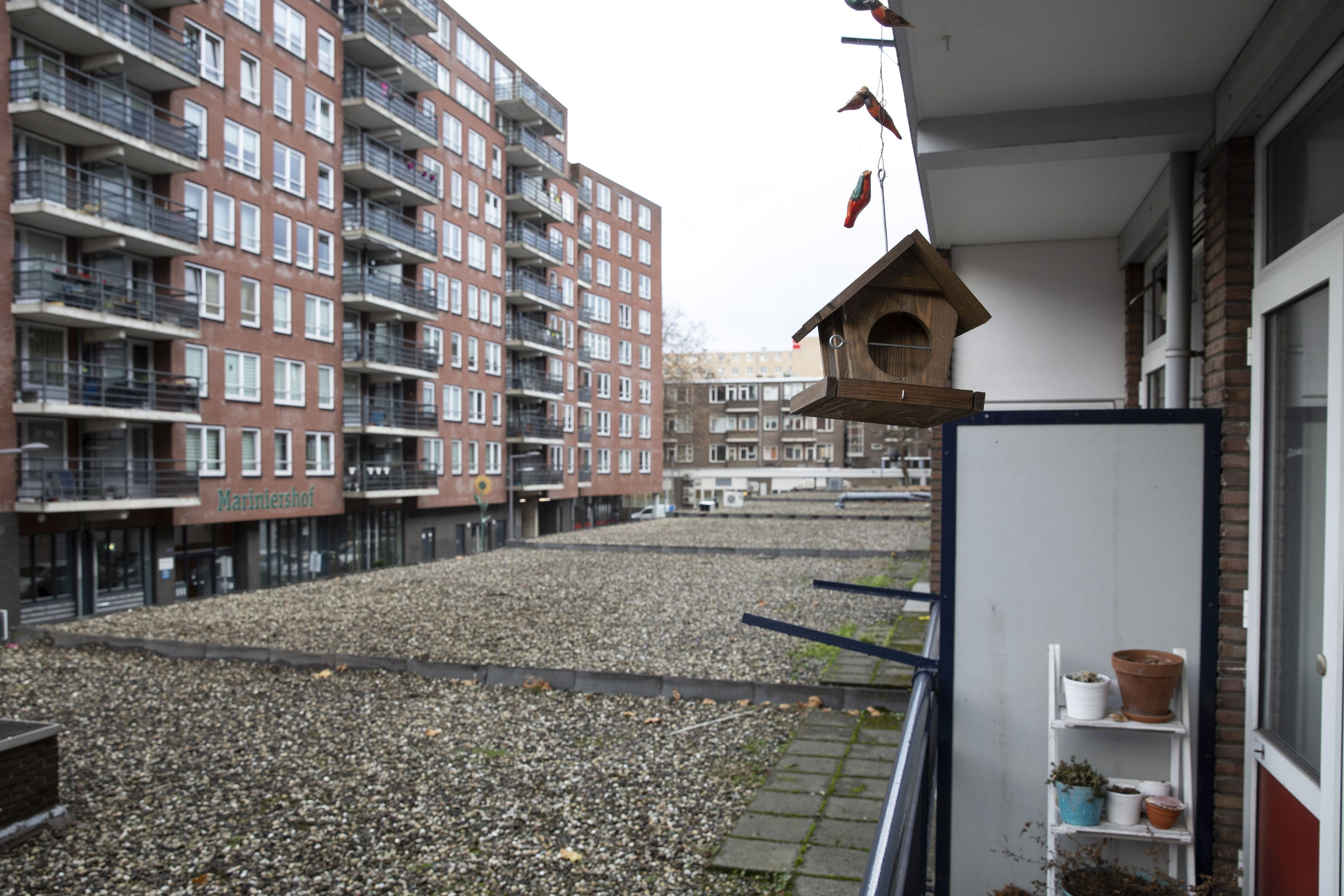 Sharon: “Er zou ook een plek moeten komen waar je fietsen en Buggy’s kunt stallen.” Pim: “En meer groen. Ik heb vijf jaar geleden bij de VvE het idee geopperd om de daken van de expeditiestraat aan de achterkant groen te maken. Dan heeft iedereen die daar op uitkijkt fijner uitzicht en de bewoners op onze verdieping krijgen er een dakterras bij.” Het idee werd destijds niet enthousiast ontvangen. “Onlangs hoorde ik dat het weer op de agenda staat onder het kopje ‘duurzaamheid’: Een groen dak gaat langer mee dan een zwart dak, je bespaart er energie mee en het straalt in de zomer minder warmte af. Als we hier zouden blijven wonen zouden we op ons dakterras ’s ochtends koffie drinken. Verder zouden we er denk ik niet veel zitten, want er komt aan die kant weinig zon.”