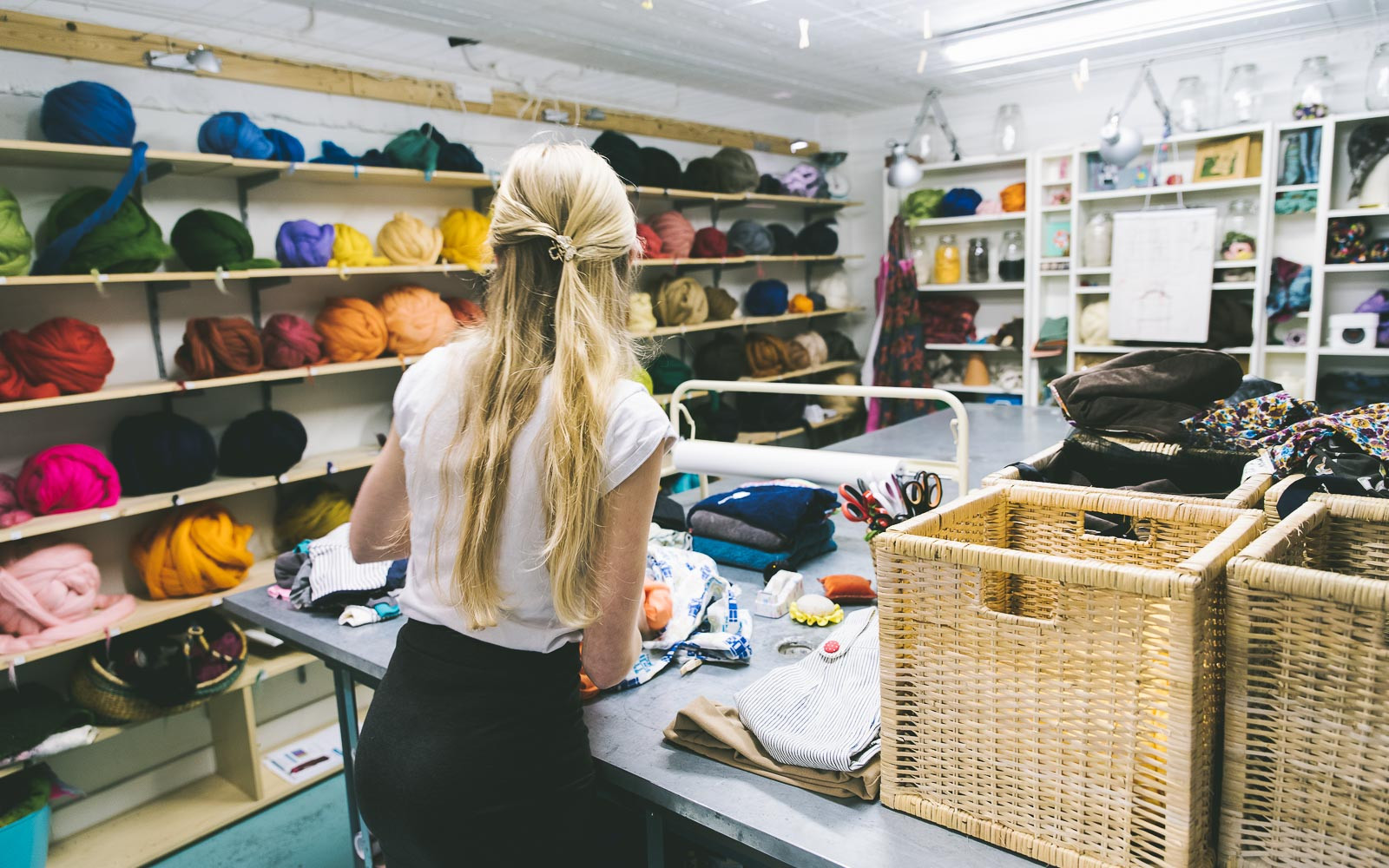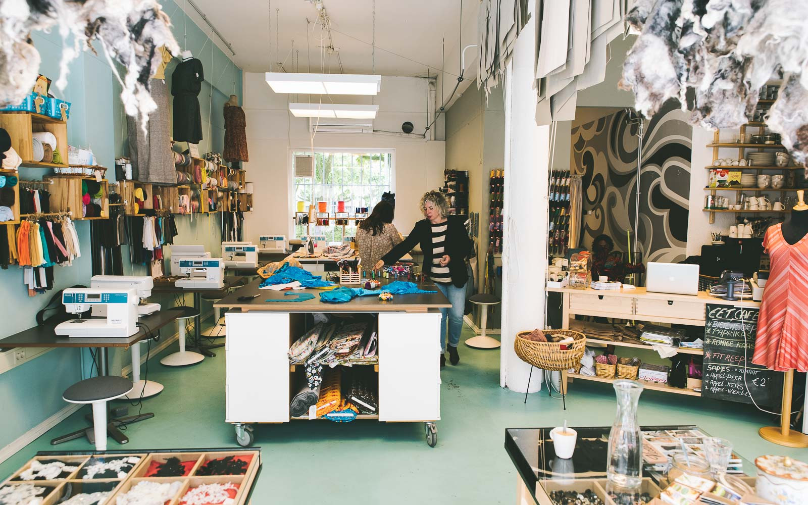 Een student die zijn broek repareert, een moeder die de bruidsjapon van haar dochter maakt, vriendinnen die elkaar adviseren op modegebied… ze ontmoeten elkaar in Naaicafé Caroline Vogel aan de leestafel met koffie, thee of een kom soep.