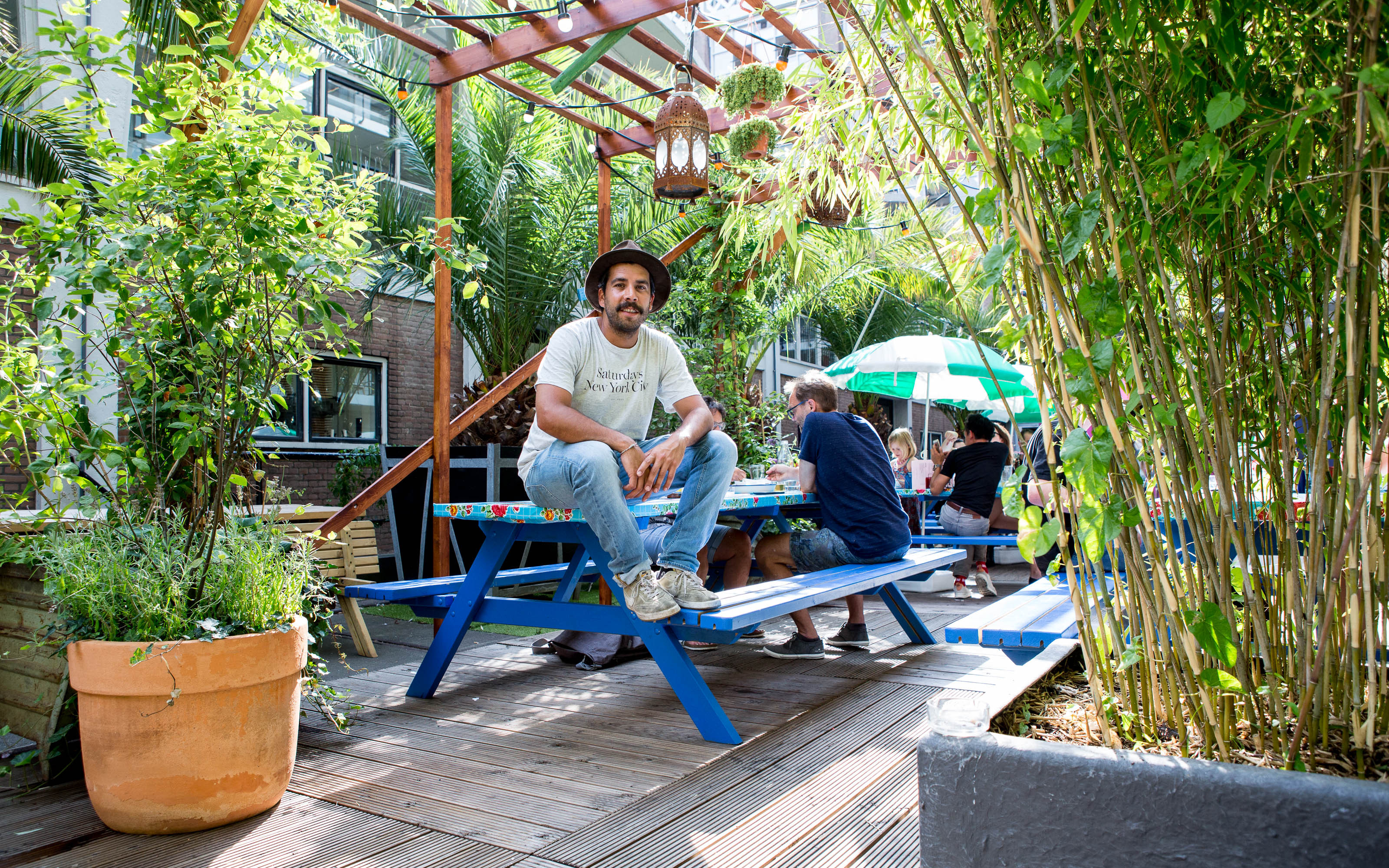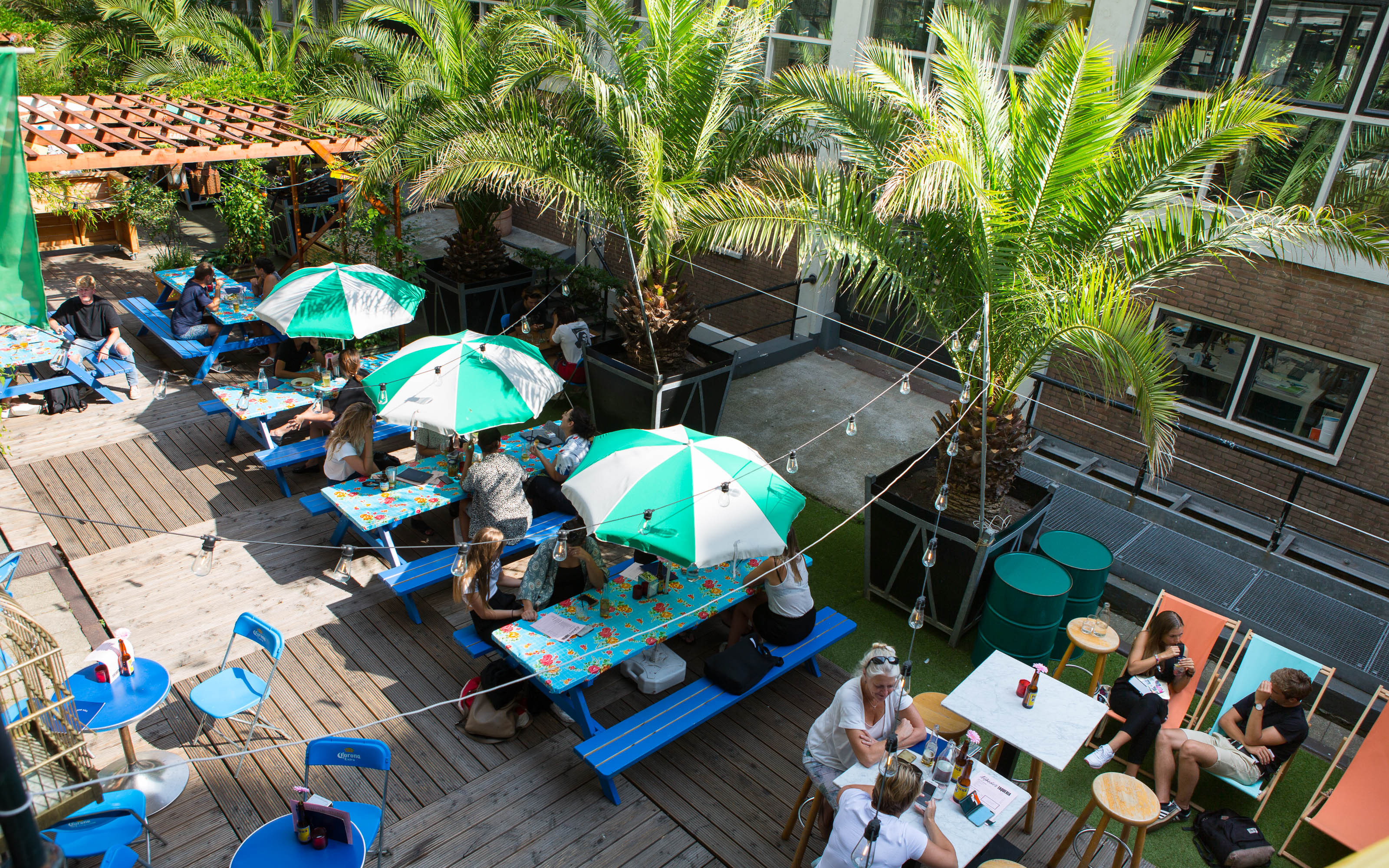 Samen met buurman en all-day breakfastrestaurant By Jarmusch deelt Alfredo’s een groot terras op de binnenplaats van Het Industriegebouw. De van oorsprong praktisch ingerichte expeditiestraat is tegenwoordig een dynamische plek voor eten, drinken en ontmoeten. Dennis: “Onze gasten krijgen tussen de palmbomen een heerlijk vakantiegevoel. Er wordt soms spontaan gedanst. Alfredo’s trekt als publiek bereisde mensen. Het is een niche en dat wordt gewaardeerd. Daarnaast is het ook een trefpunt voor buurtbewoners.”