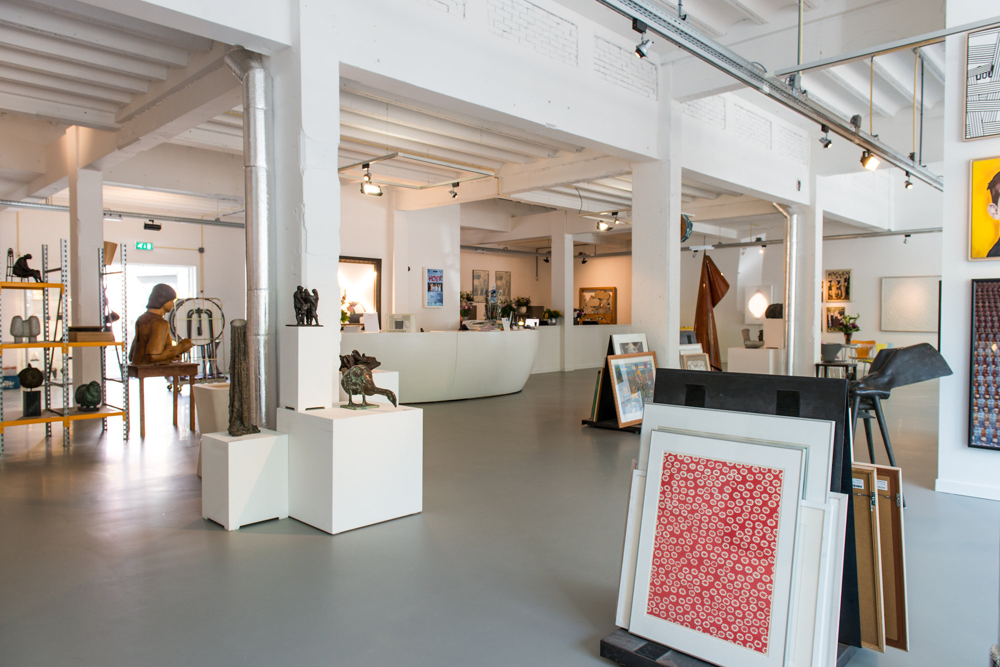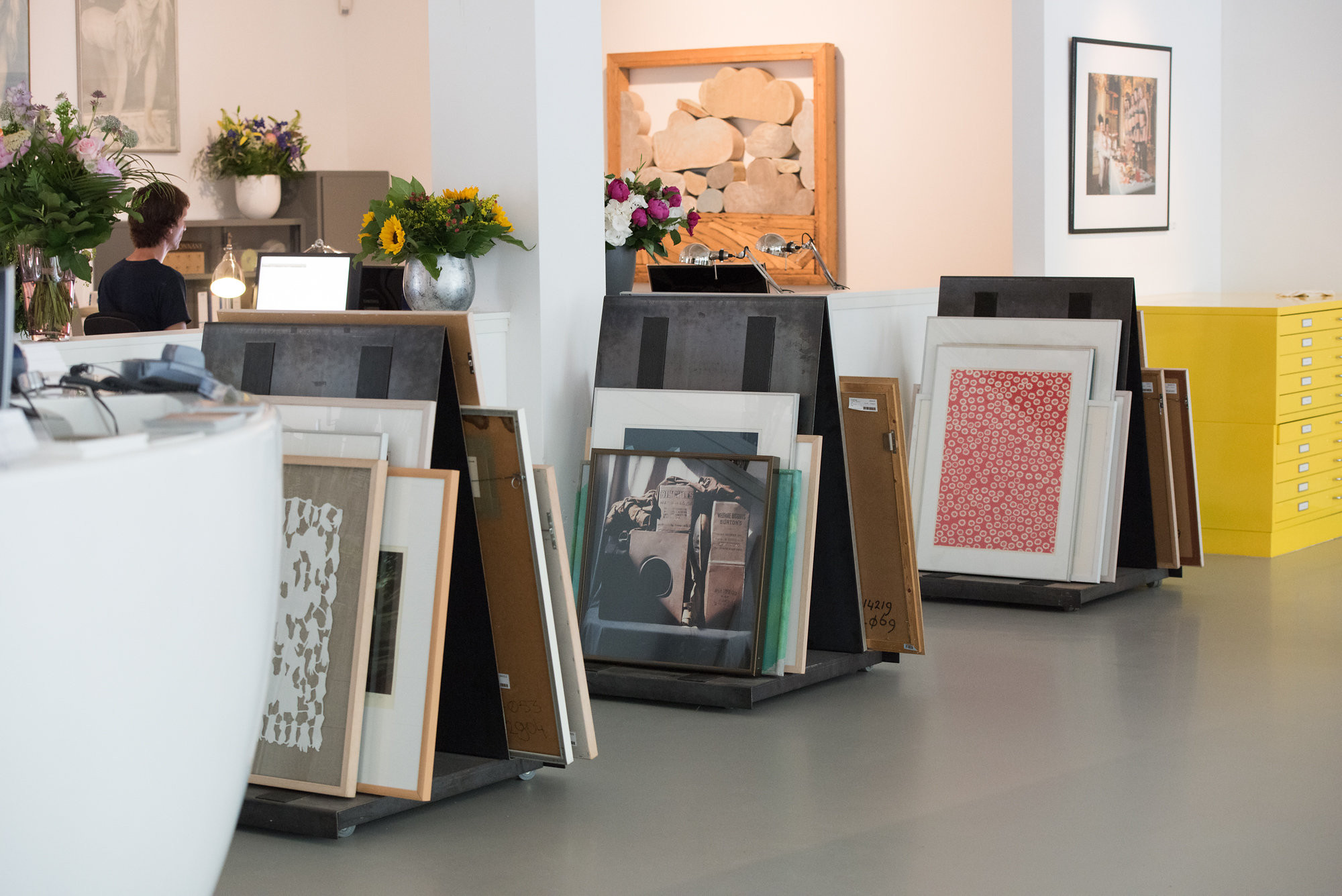 De Kunstuitleen zocht een nieuw onderkomen omdat het pand aan de Nieuwe Binnenweg werd verkocht. Een makelaar attendeerde Ellis op de Goudsesingel 268. Ze kende deze hoek van de Rotterdamse binnenstad door de Groene Passage. “Ons hele team vond het pand afschuwelijk vanwege het lage plafond.” Maar daar tegenover stonden de grote glazen pui, de overzichtelijke ruimte voor expositie boven, ruimte voor een depot in de kelder en de expeditiestraat aan de achterkant. “Ideaal als aanrijroute.” Dus ging Ellis maar eens buurten bij de buren van het Slaapbankencentrum en zag daar een soort dakjes in het plafond. Weer terug prikte ze voorzichtig in de plafondplaten. “En toen dacht ik: volgens mij kan dit een heel mooi pand zijn als je het stript.” En ze had gelijk. De witgeschilderde hoge ruimte is licht en prachtig. “Met een bijna museale uitstraling.”