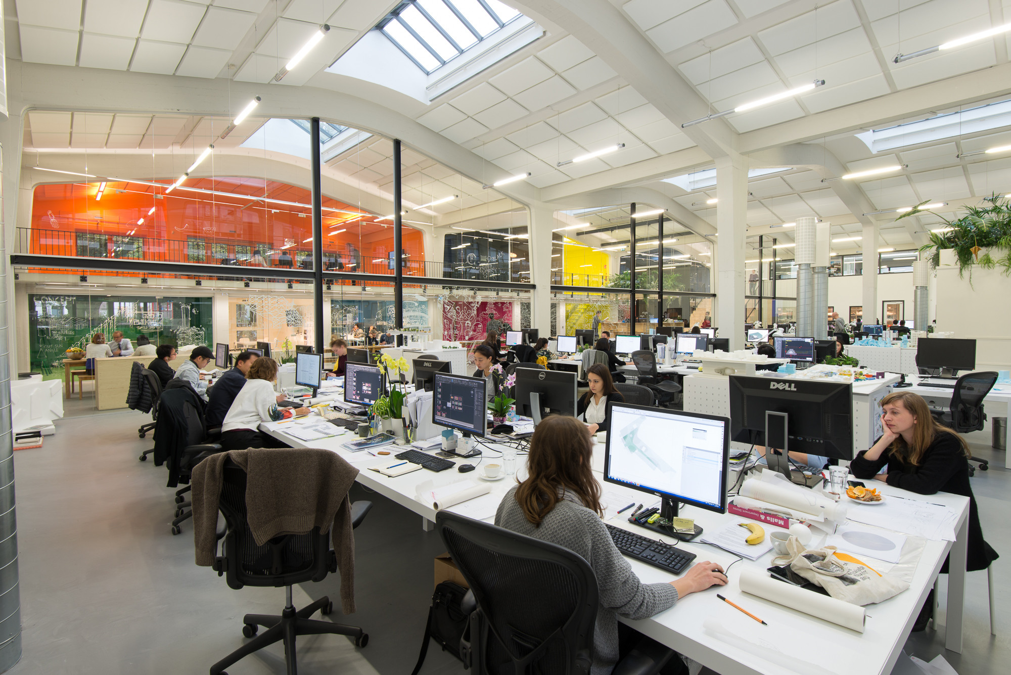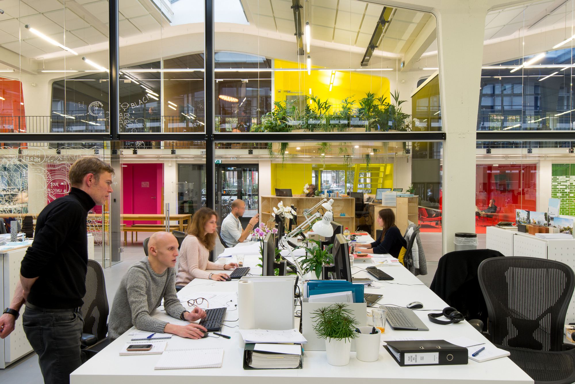 De enorme hoge ruimte aan de kant van de binnenplaats van Het Industriegebouw is juist opvallend wit en licht gebleven. Met glaswanden is een stiltezone gecreëerd waar verschillende projectteams samenwerken aan lange witte tafels. De kleur in deze ruimte komt van de planten die de medewerkers zelf hebben uitgezocht. Ook boven de ronde houten receptie bij de voordeur hangt een plantenbak, met planten die goed zijn voor de luchtkwaliteit.