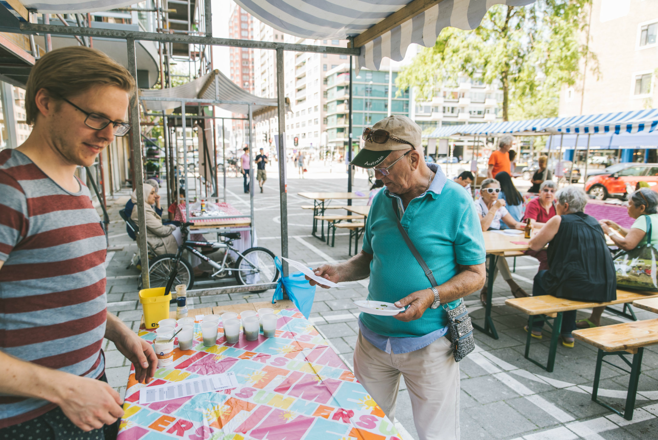 Hoogstraat, Stadsdriehoek, Rotterdam, Nederland“Hoogkwartier Proeft is een culinaire ontmoeting met lekkere en exotische hapjes. Bewoners gaan aan de slag met hun familierecepten en presenteren deze in kleine hapjes aan bezoekers. Ook ondernemers zoals Bas Borkent van Highstreet Hotdogs en Vincent Giljam van Café Cultura bieden bijzondere gerechtjes aan.” Ewald denkt dat het evenement aantoont dat er aan deze kant van de Hoogstraat steeds meer te beleven is.