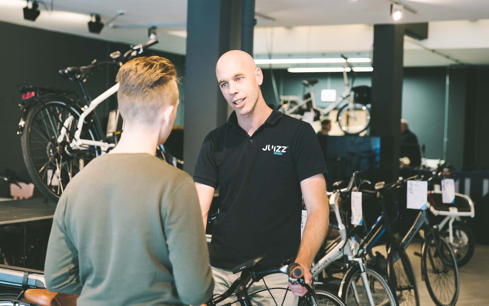 Martijn van Ouwerkerk is filiaalmanager van Juizz Rotterdam. Hij vertelt dat Juizz niet alleen verkoopt aan particulieren, maar ook de zakelijke markt voorziet van elektrisch vervoer. “We leveren fietsen aan onder andere Coca Cola, Friesland Campina en de gemeente Amsterdam”. Ook vertelt Martijn dat dit het vierde filiaal is van Juizz. Naast de nieuwe winkel in Rotterdam vind je de winkels in Amsterdam, Den Haag en Utrecht.